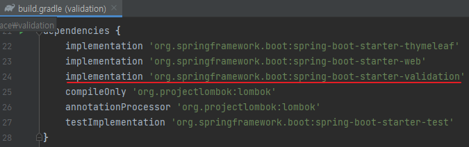 javax.validation.@Valid를 사용하려면 build.gradle 의존관계 추가가 필요하다. (이전에 추가했다.)