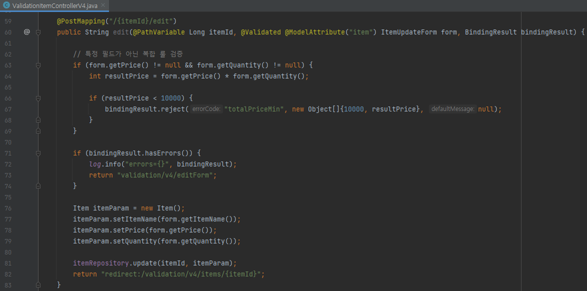 @PostMapping("/{itemId}/edit") public String edit(@PathVariable Long itemId, @Validated @ModelAttribute("item") ItemUpdateForm form, BindingResult bindingResult) { // 특정 필드가 아닌 복합 룰 검증 if (form.getPrice() != null && form.getQuantity() != null) { int resultPrice = form.getPrice() * form.getQuantity(); if (resultPrice < 10000) { bindingResult.reject("totalPriceMin", new Object[]{10000, resultPrice}, null); } } if (bindingResult.hasErrors()) { log.info("errors={}", bindingResult); return "validation/v4/editForm"; } Item itemParam = new Item(); itemParam.setItemName(form.getItemName()); itemParam.setPrice(form.getPrice()); itemParam.setQuantity(form.getQuantity()); itemRepository.update(itemId, itemParam); return "redirect:/validation/v4/items/{itemId}"; }