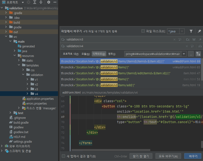 - v4폴더를 선택하고 Ctrl + Shift + R을 눌러 하위 파일의 validation/v3를 validation/v4로 모두 변경