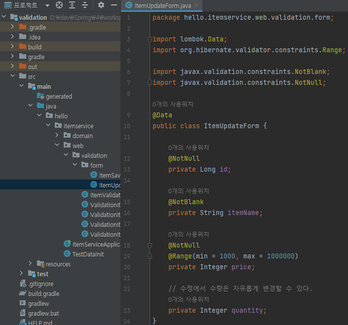 main/java/hello/itemservice/web/validation/form/ItemUpdateForm 생성