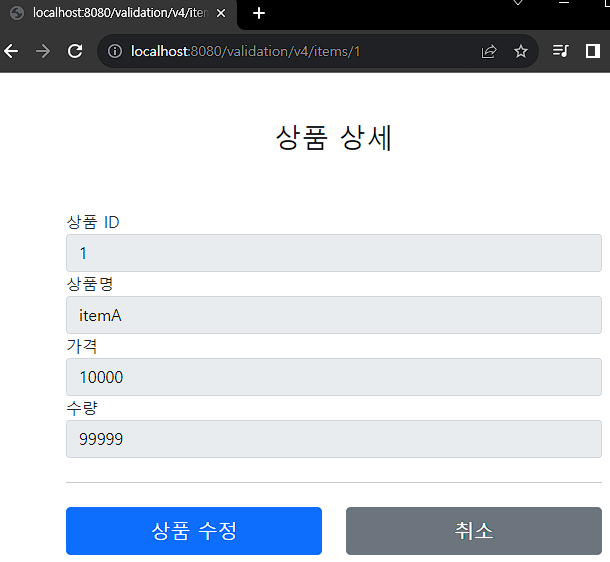 @PostMapping("/{itemId}/edit") public String edit(@PathVariable Long itemId, @Validated @ModelAttribute("item") ItemUpdateForm form, BindingResult bindingResult) { // 특정 필드가 아닌 복합 룰 검증 if (form.getPrice() != null && form.getQuantity() != null) { int resultPrice = form.getPrice() * form.getQuantity(); if (resultPrice < 10000) { bindingResult.reject("totalPriceMin", new Object[]{10000, resultPrice}, null); } } if (bindingResult.hasErrors()) { log.info("errors={}", bindingResult); return "validation/v4/editForm"; } Item itemParam = new Item(); itemParam.setItemName(form.getItemName()); itemParam.setPrice(form.getPrice()); itemParam.setQuantity(form.getQuantity()); itemRepository.update(itemId, itemParam); return "redirect:/validation/v4/items/{itemId}"; }