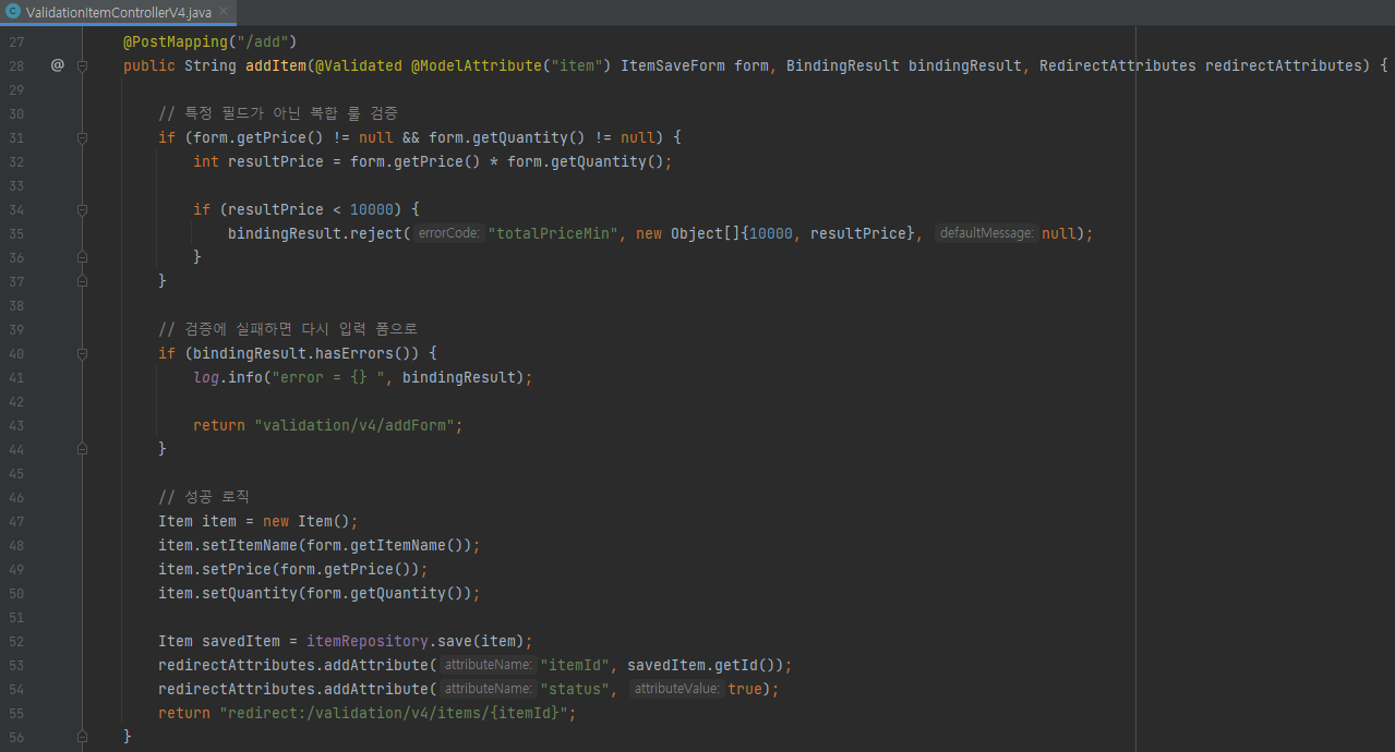 @PostMapping("/add") public String addItem(@Validated @ModelAttribute("item") ItemSaveForm form, BindingResult bindingResult, RedirectAttributes redirectAttributes) { // 특정 필드가 아닌 복합 룰 검증 if (form.getPrice() != null && form.getQuantity() != null) { int resultPrice = form.getPrice() * form.getQuantity(); if (resultPrice < 10000) { bindingResult.reject("totalPriceMin", new Object[]{10000, resultPrice}, null); } } // 검증에 실패하면 다시 입력 폼으로 if (bindingResult.hasErrors()) { log.info("error = {} ", bindingResult); return "validation/v4/addForm"; } // 성공 로직 Item item = new Item(); item.setItemName(form.getItemName()); item.setPrice(form.getPrice()); item.setQuantity(form.getQuantity()); Item savedItem = itemRepository.save(item); redirectAttributes.addAttribute("itemId", savedItem.getId()); redirectAttributes.addAttribute("status", true); return "redirect:/validation/v4/items/{itemId}"; }
