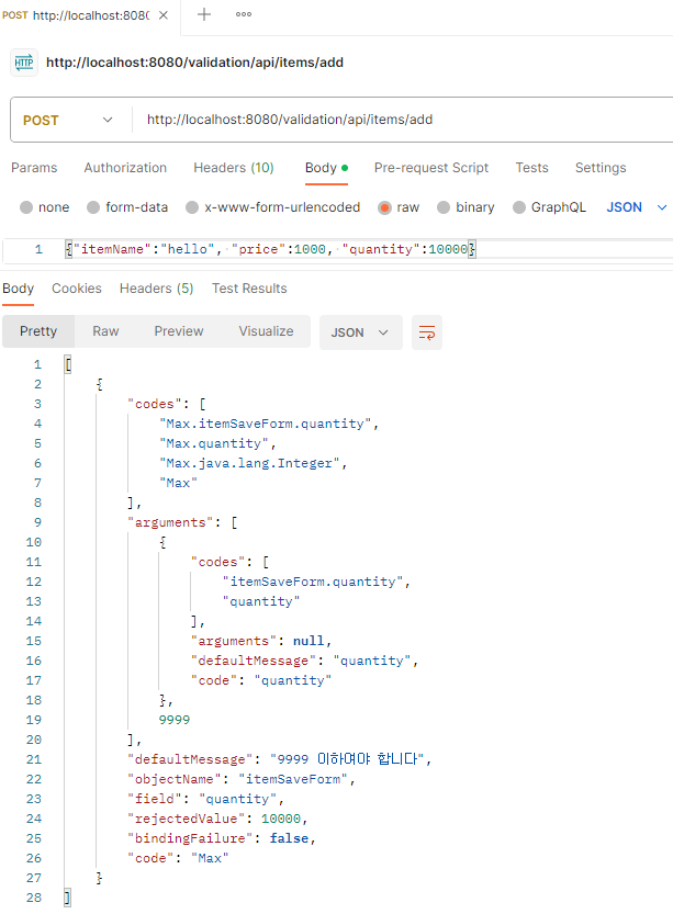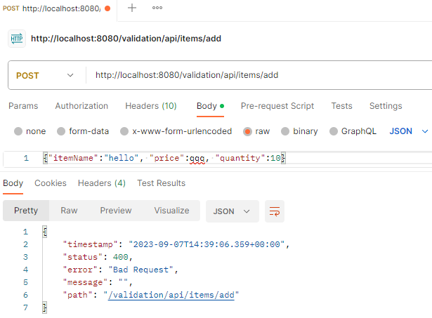 이 경우는 ItemSaveForm 객체를 만들지 못하기 때문에 컨트롤러 자체가 호출되지 않고 그전에 예외가 발생한다. 물론 Validator도 실행되지 않는다.
