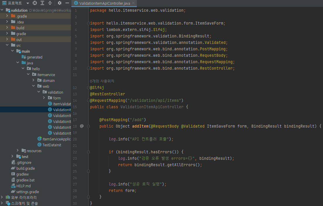 @RequestBody는 HTTP Body의 데이터를 객체로 변환할 때 사용한다. 주로 API JSON 요청을 다룰 때 사용한다.ValidationItemApiController 생성