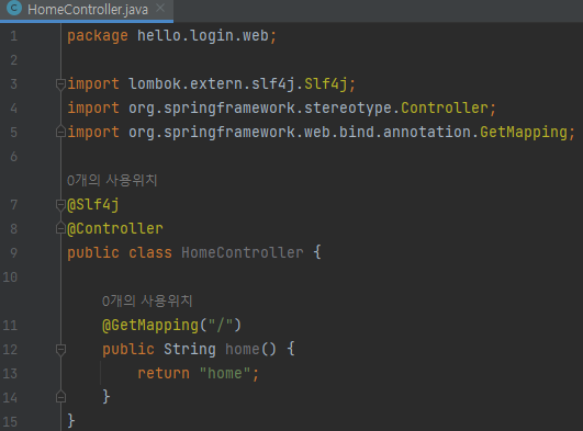 package hello.login.web; import lombok.extern.slf4j.Slf4j; import org.springframework.stereotype.Controller; import org.springframework.web.bind.annotation.GetMapping; @Slf4j @Controller public class HomeController { @GetMapping("/") public String home() { return "home"; } }