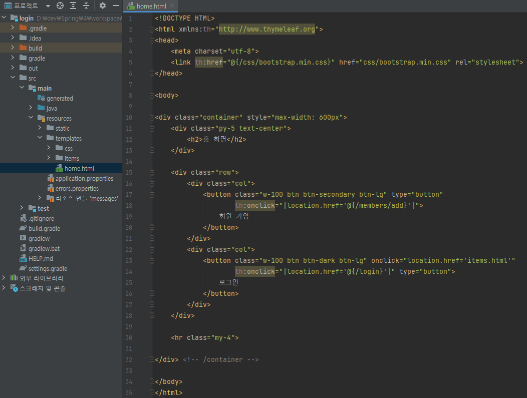 <!DOCTYPE HTML> <html xmlns:th="http://www.thymeleaf.org"> <head> <meta charset="utf-8"> <link th:href="@{/css/bootstrap.min.css}" href="css/bootstrap.min.css" rel="stylesheet"> </head> <body> <div class="container" style="max-width: 600px"> <div class="py-5 text-center"> <h2>홈 화면</h2> </div> <div class="row"> <div class="col"> <button class="w-100 btn btn-secondary btn-lg" type="button" th:onclick="|location.href='@{/members/add}'|"> 회원 가입 </button> </div> <div class="col"> <button class="w-100 btn btn-dark btn-lg" onclick="location.href='items.html'" th:onclick="|location.href='@{/login}'|" type="button"> 로그인 </button> </div> </div> <hr class="my-4"> </div> <!-- /container --> </body> </html>