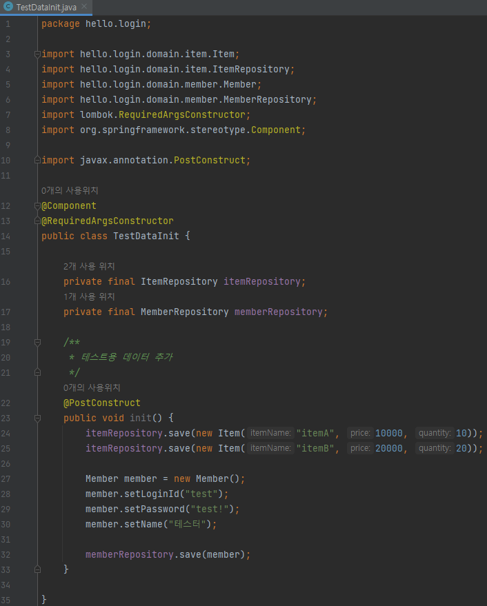package hello.login; import hello.login.domain.item.Item; import hello.login.domain.item.ItemRepository; import hello.login.domain.member.Member; import hello.login.domain.member.MemberRepository; import lombok.RequiredArgsConstructor; import org.springframework.stereotype.Component; import javax.annotation.PostConstruct; @Component @RequiredArgsConstructor public class TestDataInit { private final ItemRepository itemRepository; private final MemberRepository memberRepository; /** * 테스트용 데이터 추가 */ @PostConstruct public void init() { itemRepository.save(new Item("itemA", 10000, 10)); itemRepository.save(new Item("itemB", 20000, 20)); Member member = new Member(); member.setLoginId("test"); member.setPassword("test!"); member.setName("테스터"); memberRepository.save(member); } }