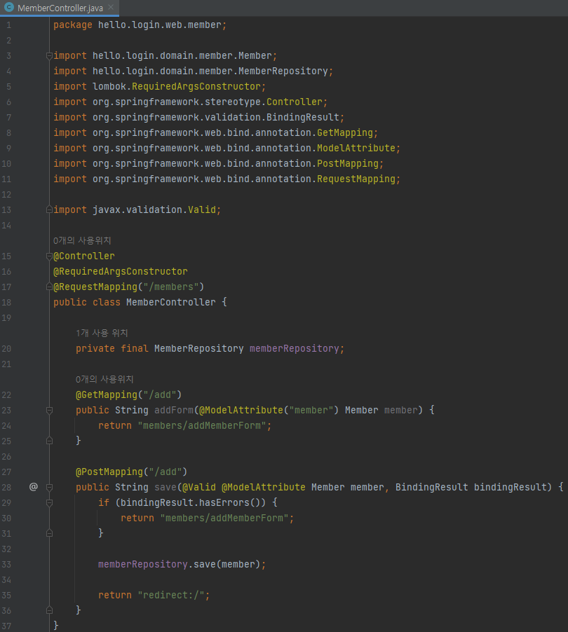 package hello.login.web.member; import hello.login.domain.member.Member; import hello.login.domain.member.MemberRepository; import lombok.RequiredArgsConstructor; import org.springframework.stereotype.Controller; import org.springframework.validation.BindingResult; import org.springframework.web.bind.annotation.GetMapping; import org.springframework.web.bind.annotation.ModelAttribute; import org.springframework.web.bind.annotation.PostMapping; import org.springframework.web.bind.annotation.RequestMapping; import javax.validation.Valid; @Controller @RequiredArgsConstructor @RequestMapping("/members") public class MemberController { private final MemberRepository memberRepository; @GetMapping("/add") public String addForm(@ModelAttribute("member") Member member) { return "members/addMemberForm"; } @PostMapping("/add") public String save(@Valid @ModelAttribute Member member, BindingResult bindingResult) { if (bindingResult.hasErrors()) { return "members/addMemberForm"; } memberRepository.save(member); return "redirect:/"; } }