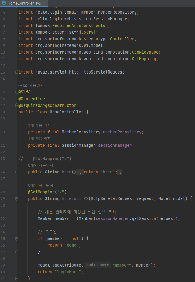private final SessionManager sessionManager; @GetMapping("/") public String homeLoginV2(HttpServletRequest request, Model model) { // 세션 관리자에 저장된 회원 정보 조회 Member member = (Member)sessionManager.getSession(request); // 로그인 if (member == null) { return "home"; } model.addAttribute("member", member); return "loginHome"; }