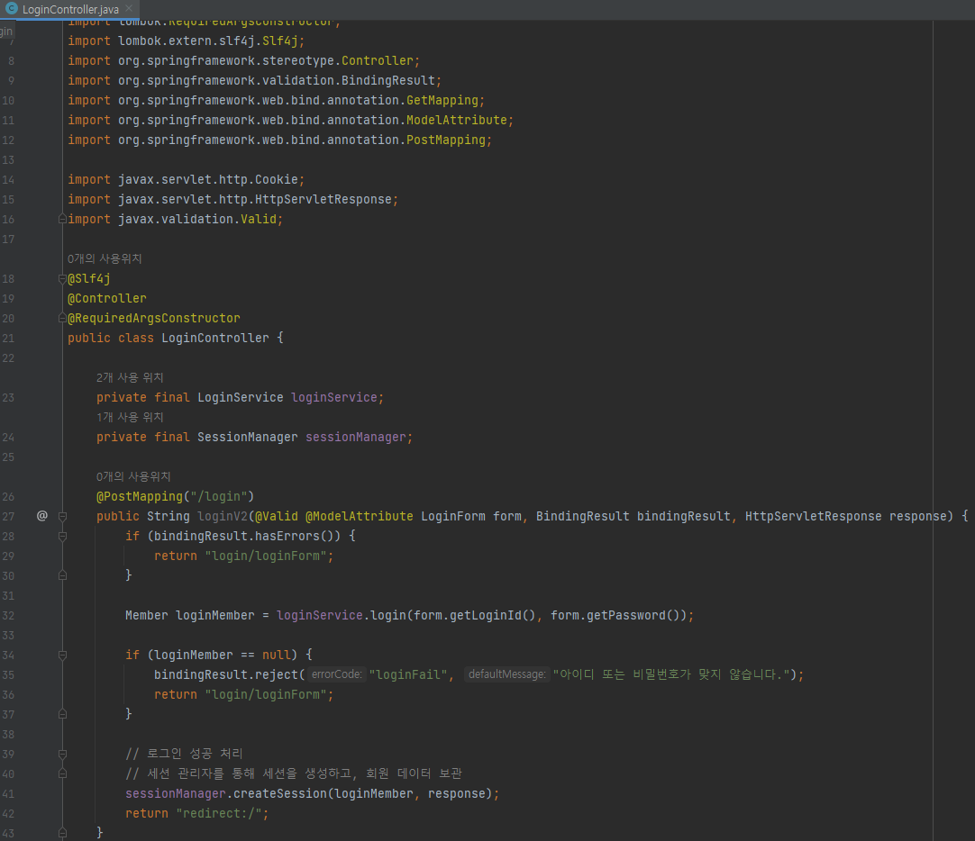 private final SessionManager sessionManager; @PostMapping("/login") public String loginV2(@Valid @ModelAttribute LoginForm form, BindingResult bindingResult, HttpServletResponse response) { if (bindingResult.hasErrors()) { return "login/loginForm"; } Member loginMember = loginService.login(form.getLoginId(), form.getPassword()); if (loginMember == null) { bindingResult.reject("loginFail", "아이디 또는 비밀번호가 맞지 않습니다."); return "login/loginForm"; } // 로그인 성공 처리 // 세션 관리자를 통해 세션을 생성하고, 회원 데이터 보관 sessionManager.createSession(loginMember, response); return "redirect:/"; }