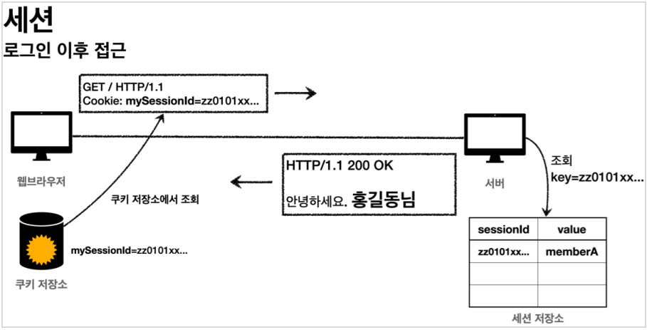 - 서버에서는 클라이언트가 전달한 mySessionId 쿠키 정보로 세션 저장소를 조회해서 로그인 시 보관한 세션 정보를 사용한다.