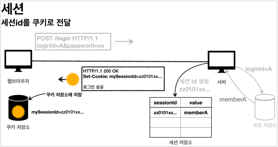 - 클라이언트는 쿠키 저장소에 mySessionId 쿠키를 보관한다.