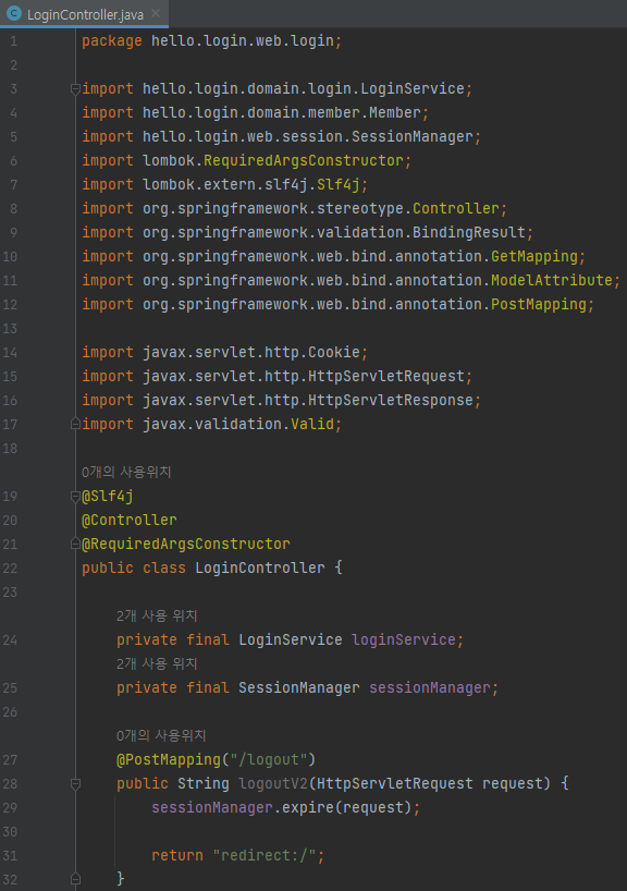 @PostMapping("/logout") public String logoutV2(HttpServletRequest request) { sessionManager.expire(request); return "redirect:/"; }