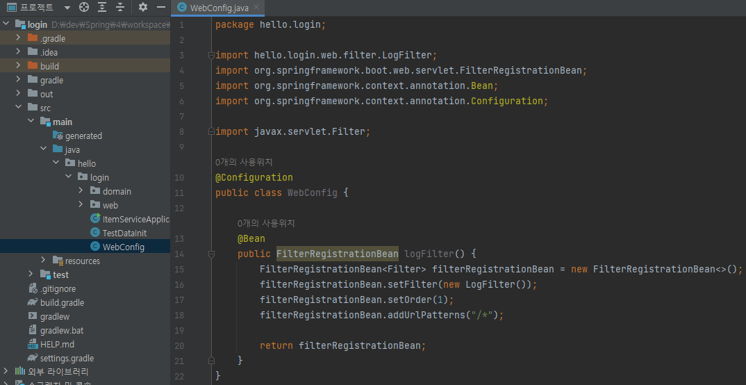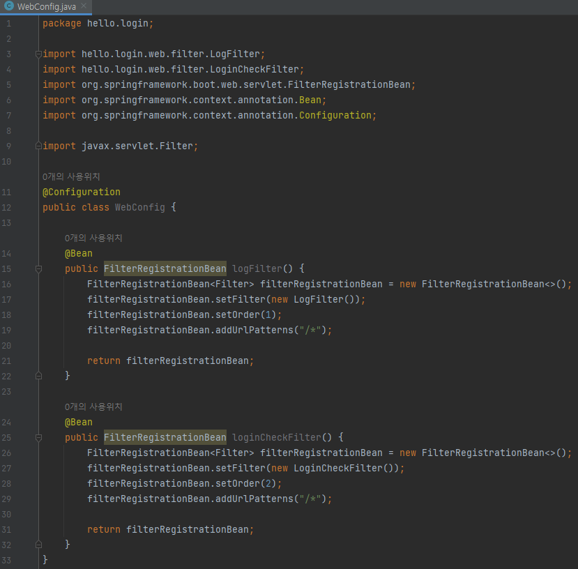 필터를 등록하는 방법은 여러 가지가 있지만, 스프링 부트를 사용한다면 FilterRegistrationBean을 사용해서 등록하면 된다.