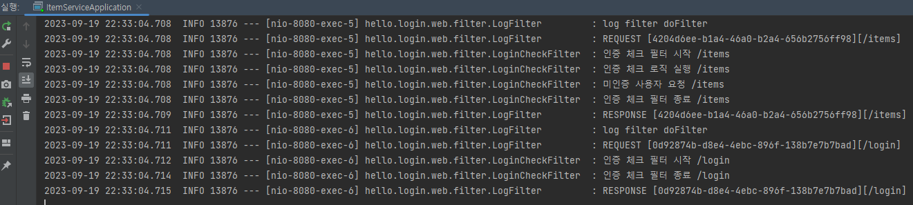 @ServletComponentScan @WebFilter(filterName = "logFilter", urlPatterns = "/*")로 필터 등록이 가능하지만 필터 순서 조절이 안된다. 따라서 FilterRegistrationBean을 사용하자.실행 로그