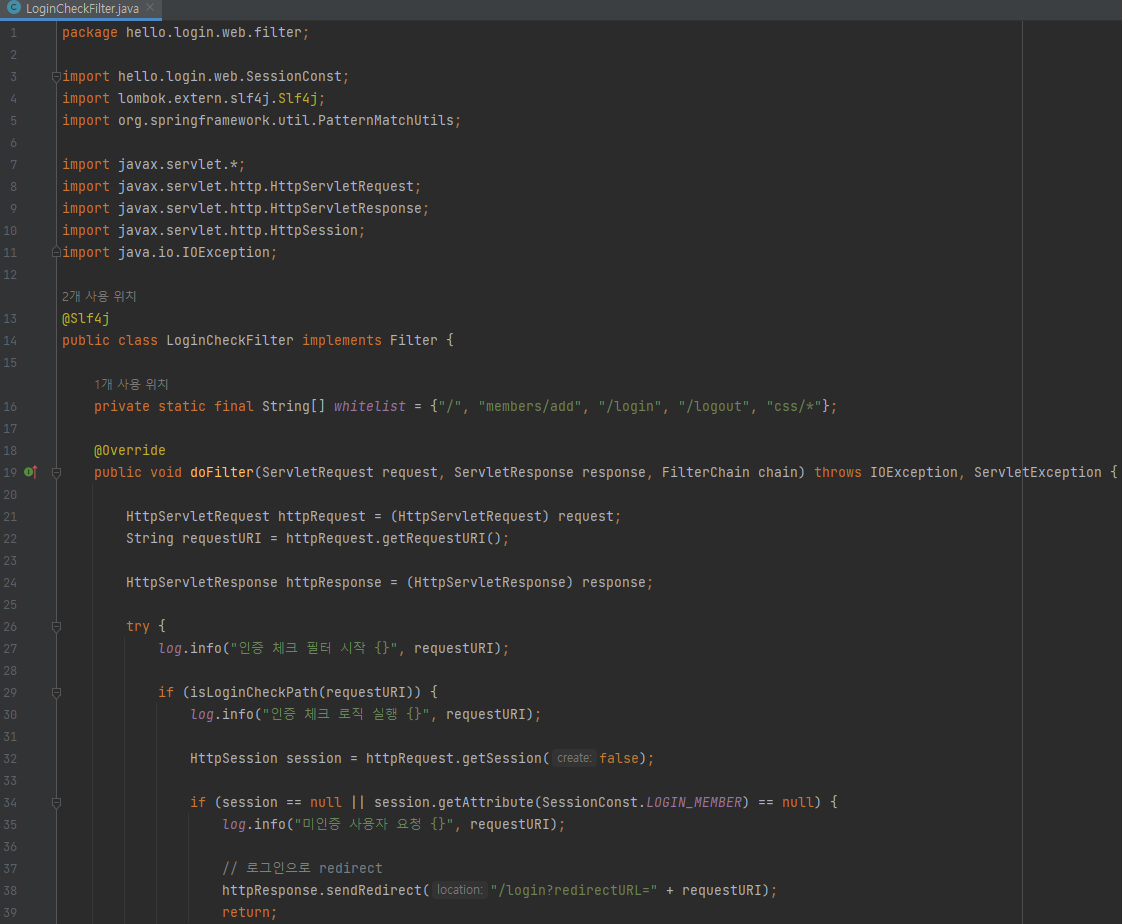 - return; 여기가 중요하다. 필터를 더는 진행하지 않는다. 이후 필터는 물론 서블릿, 컨트롤러가 더는 호출되지 않는다. 앞서 redirect를 사용했기 때문에 redirect가 응답으로 적용되고 요청이 끝난다.
