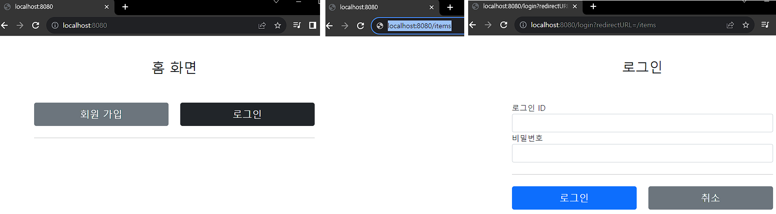 - 미인증 사용자는 로그인 화면으로 리다이렉트 한다. 그런데 로그인 이후에 다시 홈으로 이동해 버리면, 원하는 경로를 다시 찾아가야 하는 불편함이 있다. 예를 들어서 상품 관리 화면을 보려고 들어갔다가 로그인 화면으로 이동하면, 로그인 이후에 다시 상품 관리 화면으로 들어가는 것이 좋다. 이런 부분이 개발자 입장에서는 좀 귀찮을 수 있어도 사용자 입장으로 보면 편리한 기능이다. 이러한 기능을 위해 현재 요청한 경로인 requestURI를 /login에 쿼리 파라미터로 함께 전달한다. 물론 /login 컨트롤러에서 로그인 성공 시 해당 경로로 이동하는 기능은 추가로 개발해야 한다.