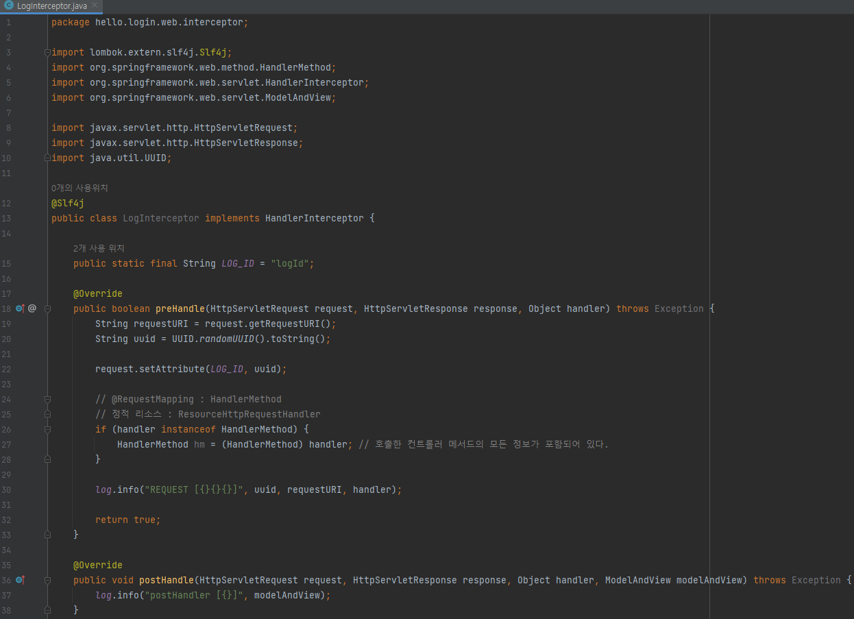 서블릿 필터와 비교해서 코드가 매우 간결하다. 인증이라는 것은 컨트롤러 호출 전에만 호출되면 된다. 따라서 preHandle만 구현하면 된다.