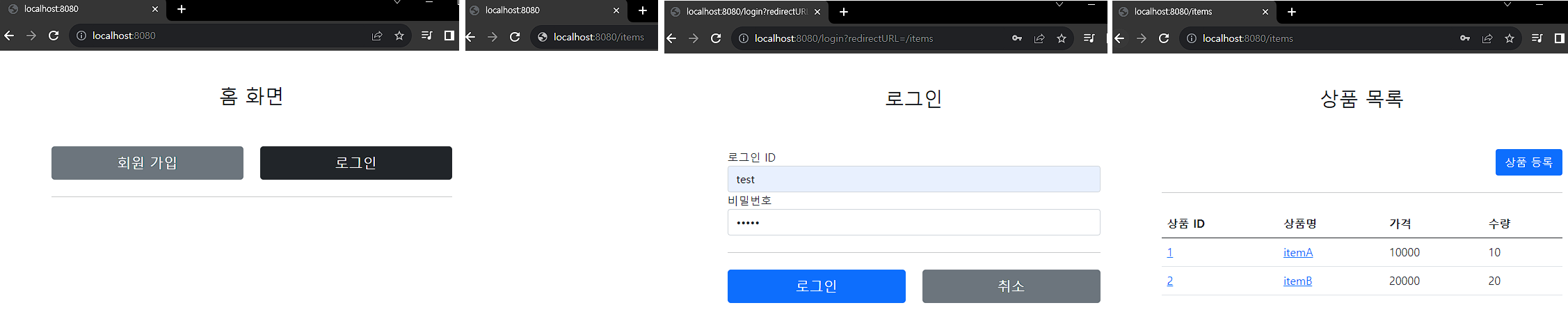 package hello.login; import hello.login.web.filter.LogFilter; import hello.login.web.filter.LoginCheckFilter; import hello.login.web.interceptor.LogInterceptor; import hello.login.web.interceptor.LoginCheckInterceptor; import org.springframework.boot.web.servlet.FilterRegistrationBean; import org.springframework.context.annotation.Bean; import org.springframework.context.annotation.Configuration; import org.springframework.web.servlet.config.annotation.InterceptorRegistry; import org.springframework.web.servlet.config.annotation.WebMvcConfigurer; import javax.servlet.Filter; @Configuration public class WebConfig implements WebMvcConfigurer { @Override public void addInterceptors(InterceptorRegistry registry) { registry.addInterceptor(new LogInterceptor()) .order(1) .addPathPatterns("/**") .excludePathPatterns("/css/**", "/*.ico", "/error"); registry.addInterceptor(new LoginCheckInterceptor()) .order(2) .addPathPatterns("/**") .excludePathPatterns("/", "/members/add", "/login", "/logout", "/css/**", "/*.ico", "/error"); } // @Bean public FilterRegistrationBean logFilter() { FilterRegistrationBean<Filter> filterRegistrationBean = new FilterRegistrationBean<>(); filterRegistrationBean.setFilter(new LogFilter()); filterRegistrationBean.setOrder(1); filterRegistrationBean.addUrlPatterns("/*"); return filterRegistrationBean; } // @Bean public FilterRegistrationBean loginCheckFilter() { FilterRegistrationBean<Filter> filterRegistrationBean = new FilterRegistrationBean<>(); filterRegistrationBean.setFilter(new LoginCheckFilter()); filterRegistrationBean.setOrder(2); filterRegistrationBean.addUrlPatterns("/*"); return filterRegistrationBean; } }인터셉터와 필터가 중복되지 않도록 필터를 등록하기 위한 logFilter(), loginCheckFilter()의 @Bean은 주석처리하자.