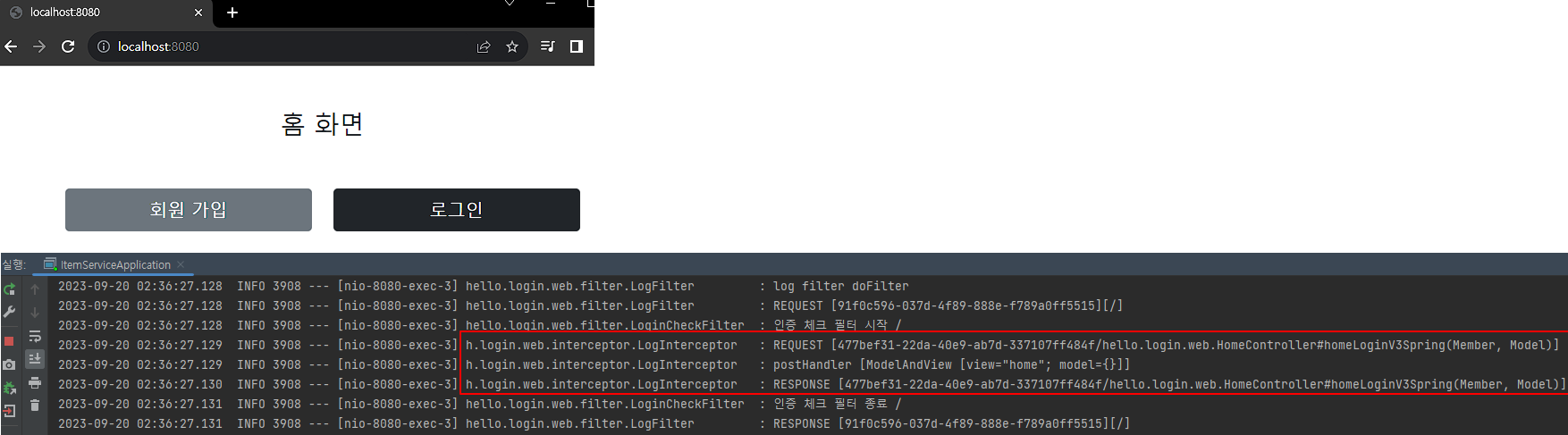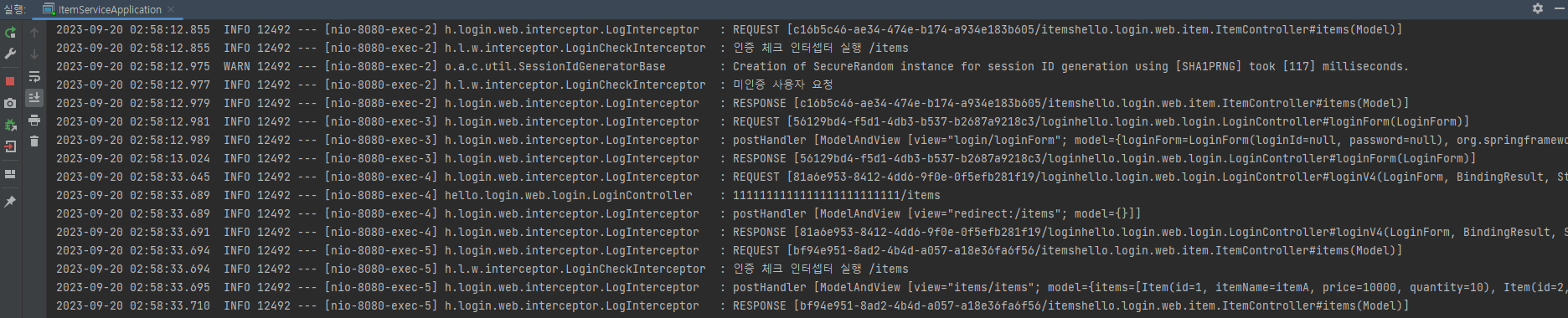 인터셉터와 필터가 중복되지 않도록 필터를 등록하기 위한 logFilter()의 @Bean은 주석처리하자.