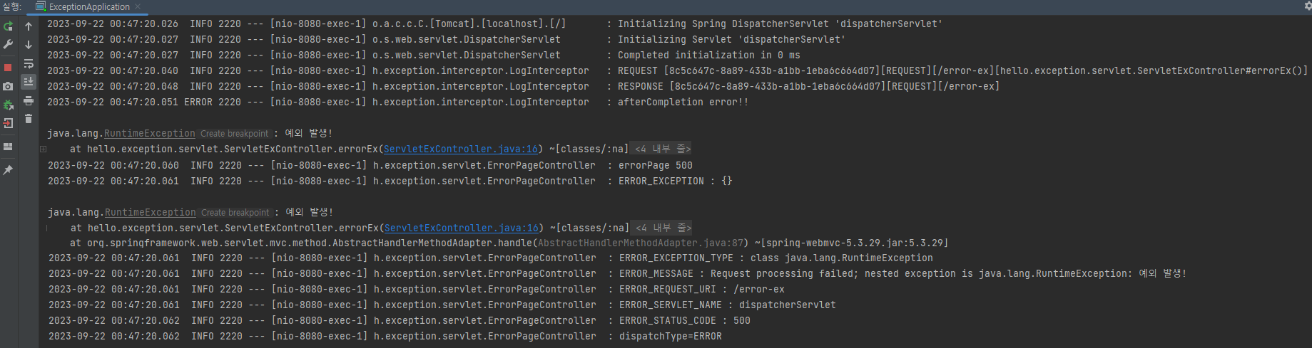 1. WAS(/error-ex, dispatchType=REQUEST) -> 필터 -> 서블릿 -> 인터셉터 -> 컨트롤러