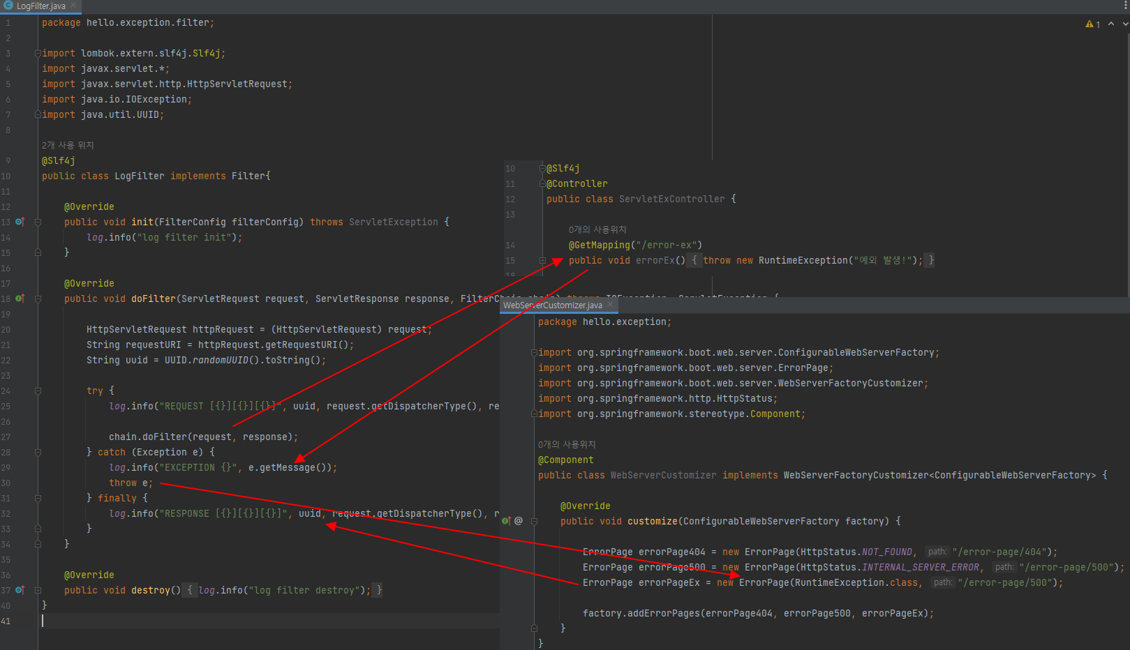 이렇게 두 가지를 모두 넣으면 클라이언트 요청은 물론이고, 오류 페이지 요청에서도 필터가 호출된다.