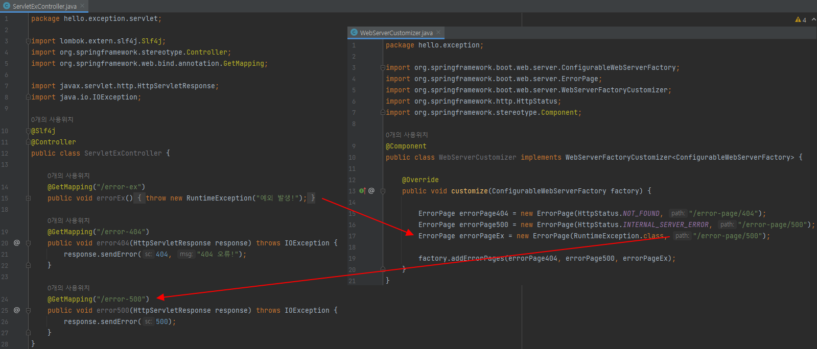 new ErrorPage(RuntimeException.class, "/error-page/500")