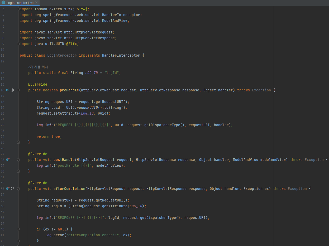 인터셉터와 중복으로 처리되지 않기 위해 앞의 logFilter()의 @Bean에 주석을 달아두자.