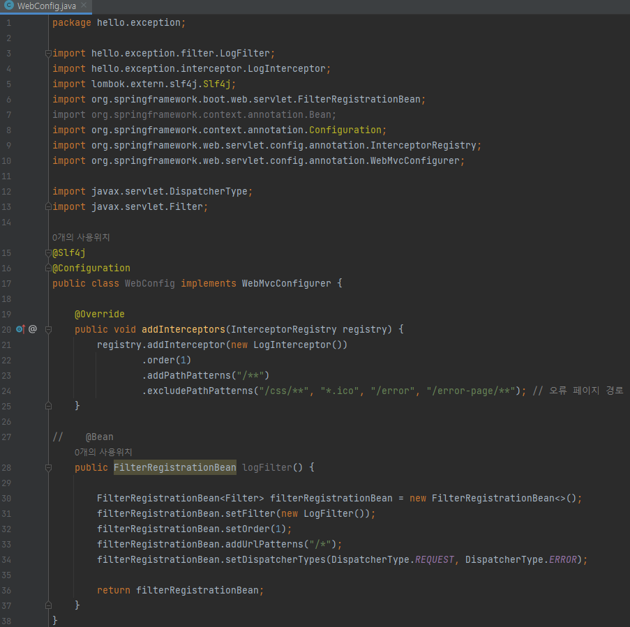 대신에 인터셉터는 다음과 같이 요청 경로에 따라서 추가하거나 제외하기 쉽게 되어 있기 때문에, 이러한 설정을 사용해서 오류 페이지 경로를 excludePathPatterns를 사용해서 빼주면 된다.