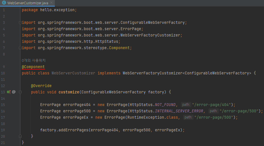 WebServerCustomizer가 다시 사용되도록 하기 위해 @Component 애노테이션에 있는 주석을 풀자.