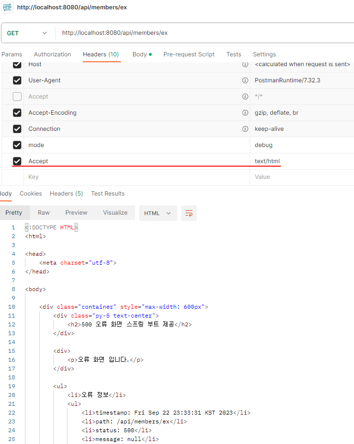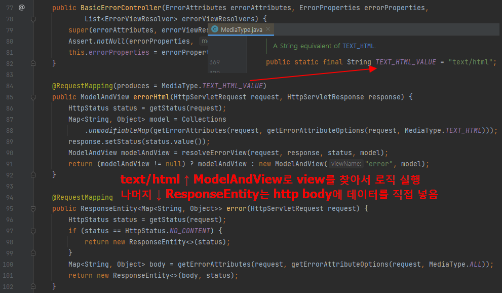 - errorHtml() : produces = MediaType.TEXT_HTML_VALUE : 클라이언트 요청의 Accept 해더 값이 text/html인 경우에는 errorHtml()을 호출해서 view를 제공한다.