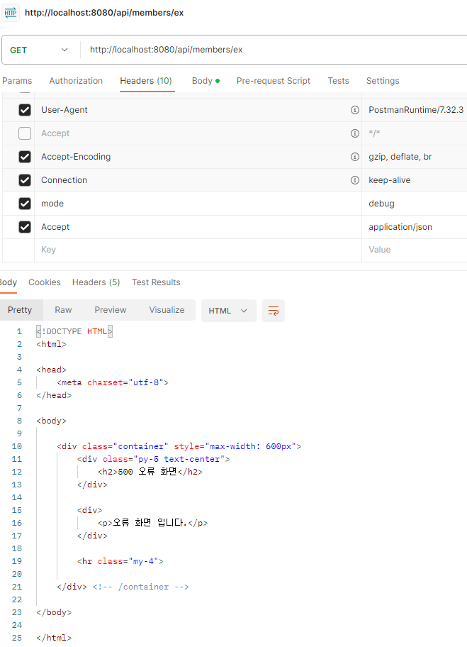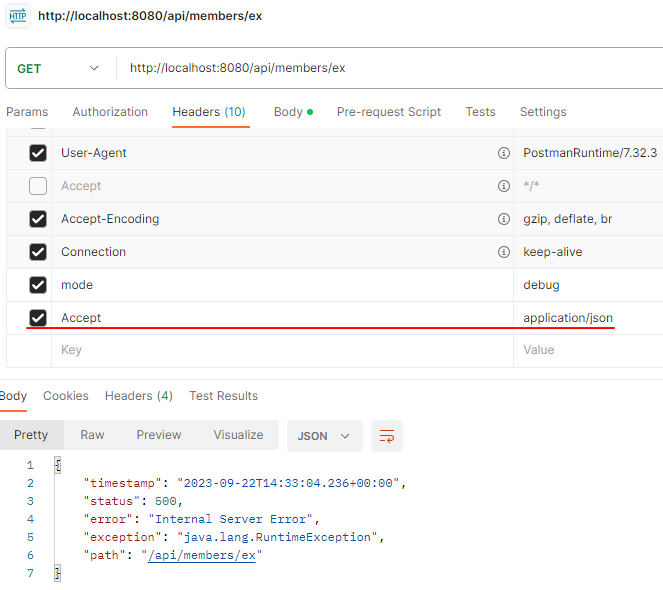 HTTP Header에 Accept가 application/json이 아니면, 기존 오류 응답인 HTML 응답이 출력되는 것을 확인할 수 있다.