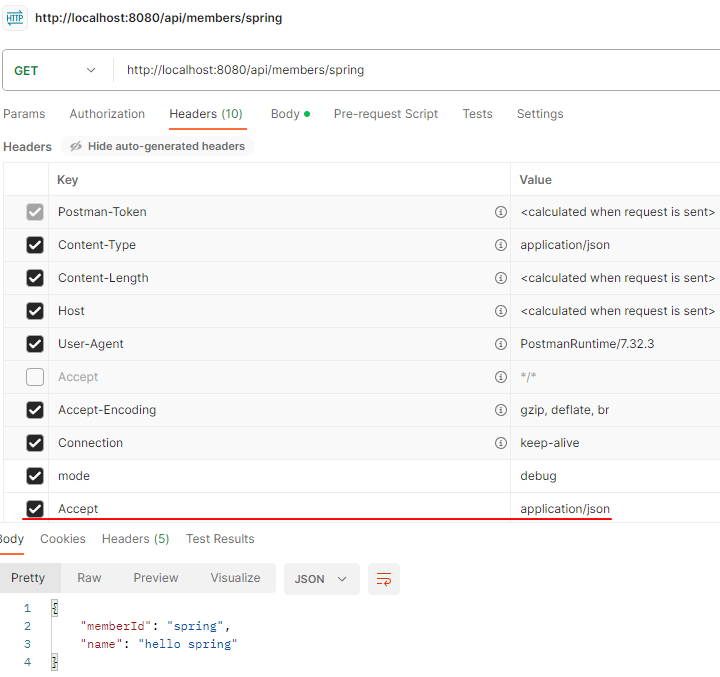produces = MediaType.APPLICATION_JSON_VALUE의 뜻은 클라이언트가 요청하는 HTTP Header의 Accept의 값이 application/json일 때 해당 메서드가 호출된다는 것이다. 결국 클라이언트가 받고 싶은 미디어타입이 json이면 이 컨트롤러의 메서드가 호출된다.