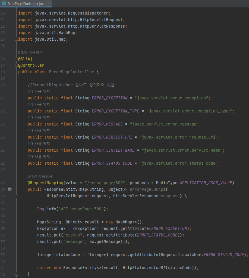 public ResponseEntity<Map<String, Object>> error(HttpServletRequest request) {}/error 동일한 경로를 처리하는 errorHtml(), error() 두 메서드를 확인할 수 있다.