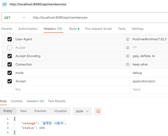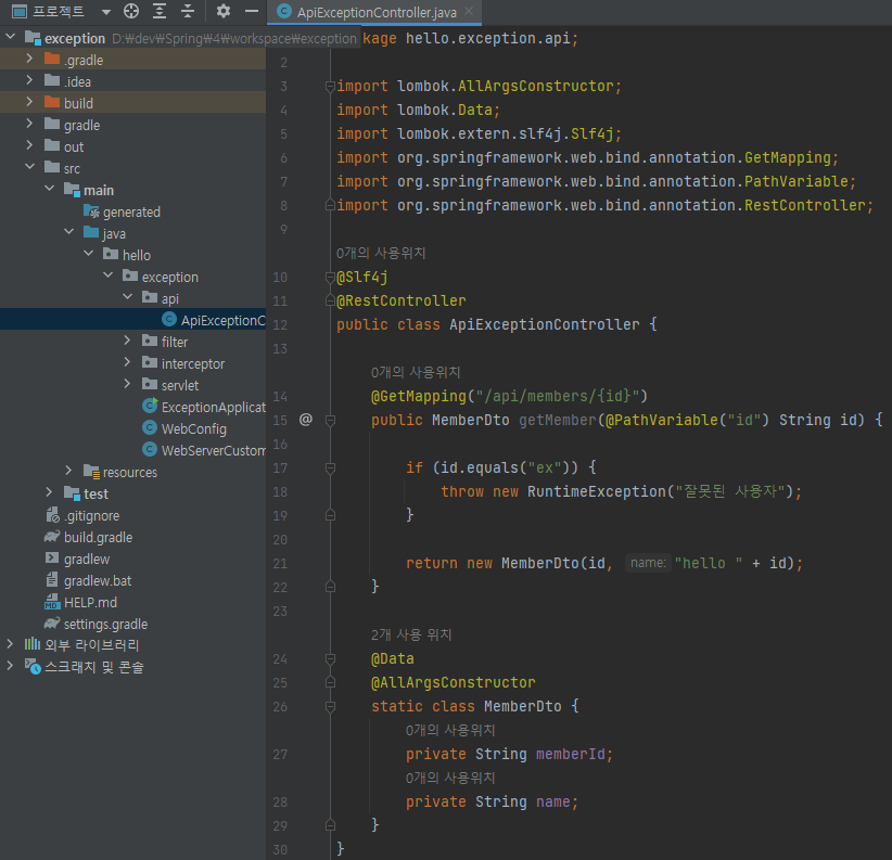 단순히 회원을 조회하는 기능을 하나 만들었다. 예외 테스트를 위해 URL에 전달된 id의 값이 ex이면 예외가 발생하도록 코드를 심어두었다.