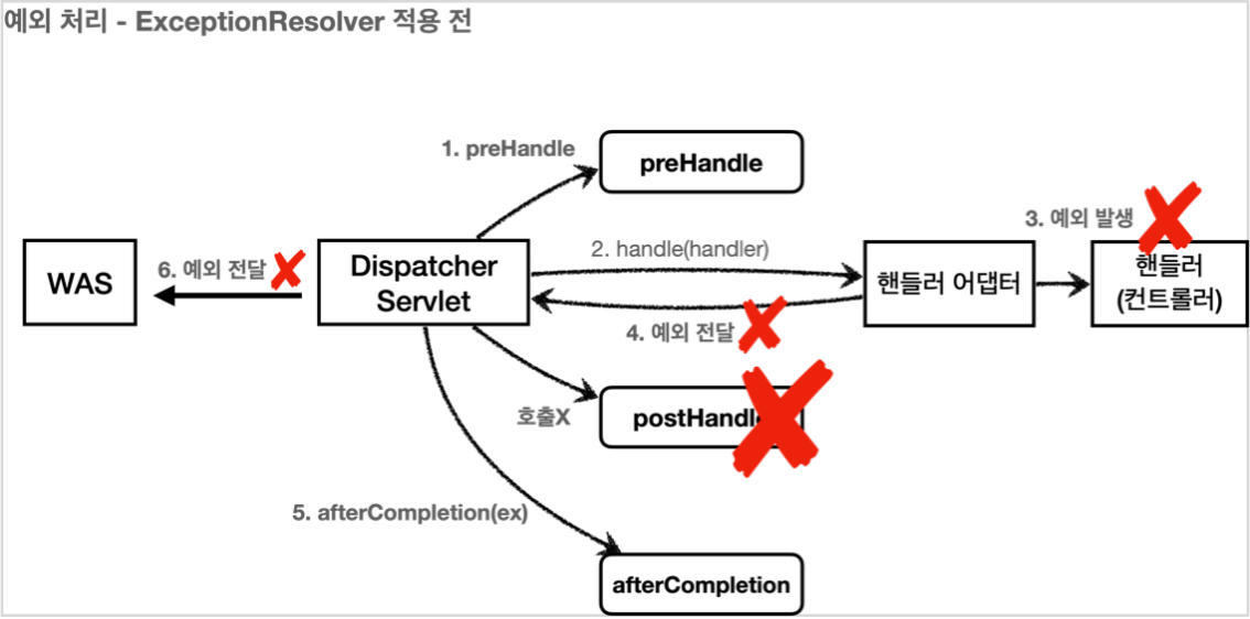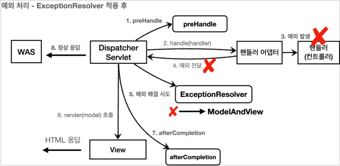 참고: ExceptionResolver로 예외를 해결해도 postHandle()은 호출되지 않는다.
