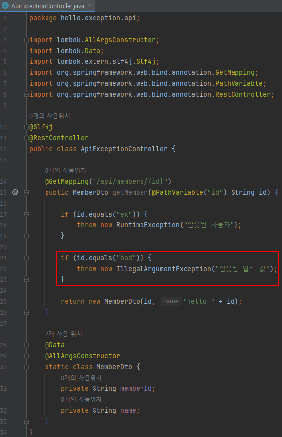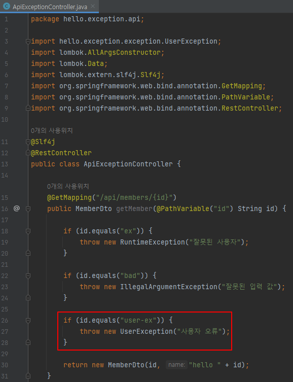 package hello.exception.api; import hello.exception.exception.UserException; import lombok.AllArgsConstructor; import lombok.Data; import lombok.extern.slf4j.Slf4j; import org.springframework.web.bind.annotation.GetMapping; import org.springframework.web.bind.annotation.PathVariable; import org.springframework.web.bind.annotation.RestController; @Slf4j @RestController public class ApiExceptionController { @GetMapping("/api/members/{id}") public MemberDto getMember(@PathVariable("id") String id) { if (id.equals("ex")) { throw new RuntimeException("잘못된 사용자"); } if (id.equals("bad")) { throw new IllegalArgumentException("잘못된 입력 값"); } if (id.equals("user-ex")) { throw new UserException("사용자 오류"); } return new MemberDto(id, "hello " + id); } @Data @AllArgsConstructor static class MemberDto { private String memberId; private String name; } }