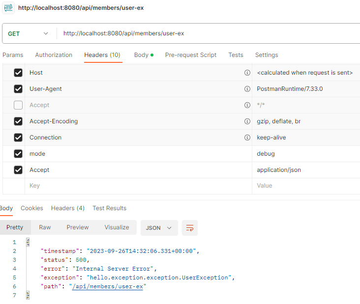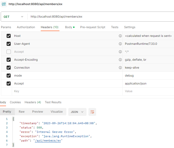 상태 코드가 500인 것을 확인할 수 있다.
