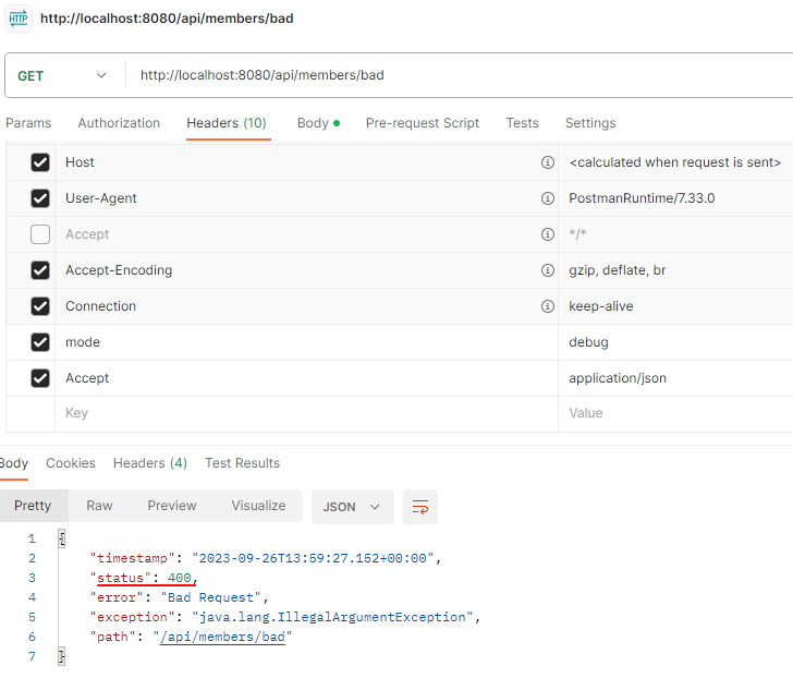 예를 들어서 IllegalArgumentException을 처리하지 못해서 컨트롤러 밖으로 넘어가는 일이 발생하면 HTTP 상태코드를 400으로 처리하고 싶다. 어떻게 해야할까?