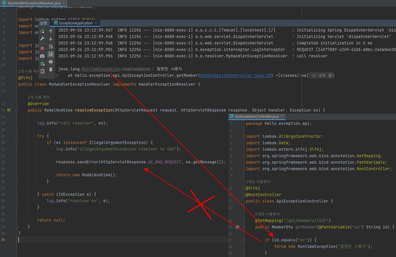 - Exception ex : 핸들러(컨트롤러)에서 발생한 발생한 예외