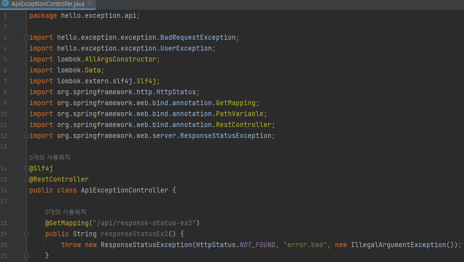 추가로 애노테이션을 사용하기 때문에 조건에 따라 동적으로 변경하는 것도 어렵다. 이때는 ResponseStatusException 예외를 사용하면 된다.