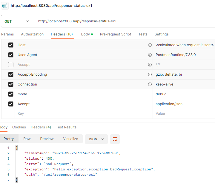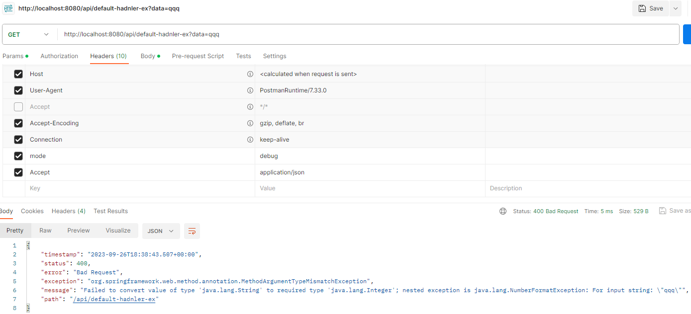 그런데 파라미터 바인딩은 대부분 클라이언트가 HTTP 요청 정보를 잘못 호출해서 발생하는 문제이다. HTTP에서는 이런 경우 HTTP 상태 코드 400을 사용하도록 되어 있다.