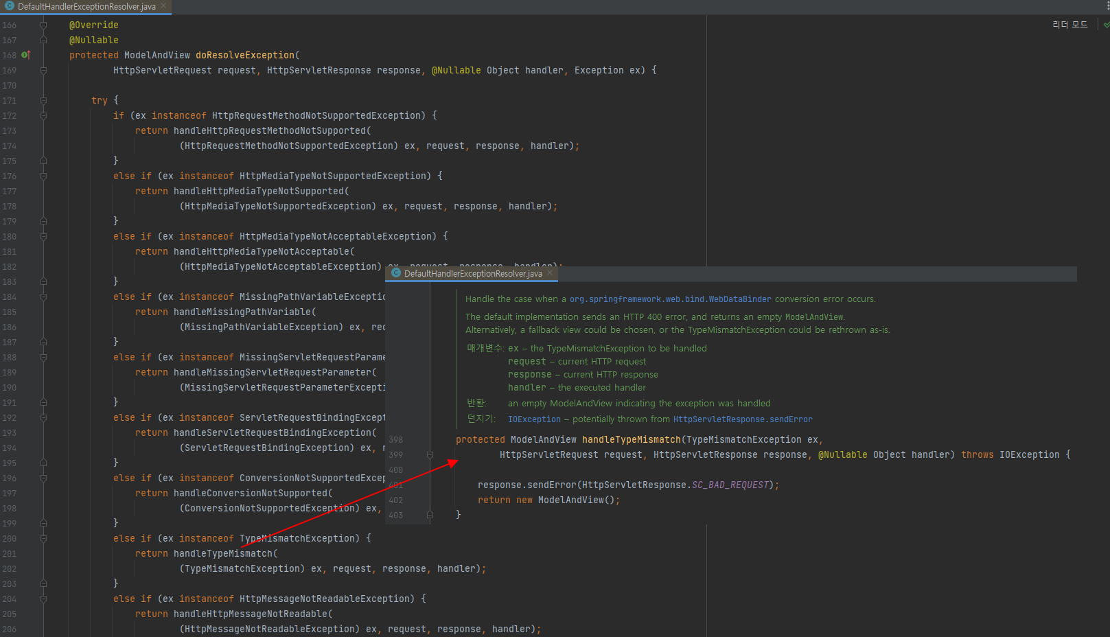 DefaultHandlerExceptionResolver는 이것을 500 오류가 아니라 HTTP 상태 코드 400 오류로 변경한다.
