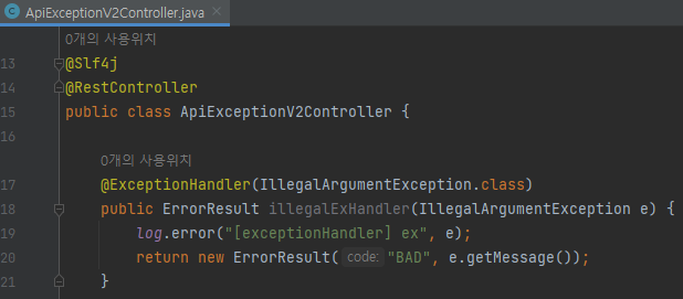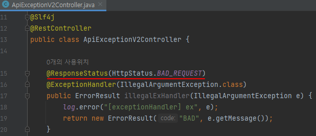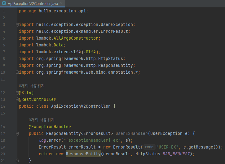 public ResponseEntity<ErrorResult> userExHandle(UserException e) {}상태 코드 변경 - ApiExceptionV2Controller