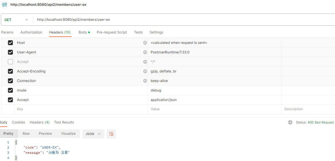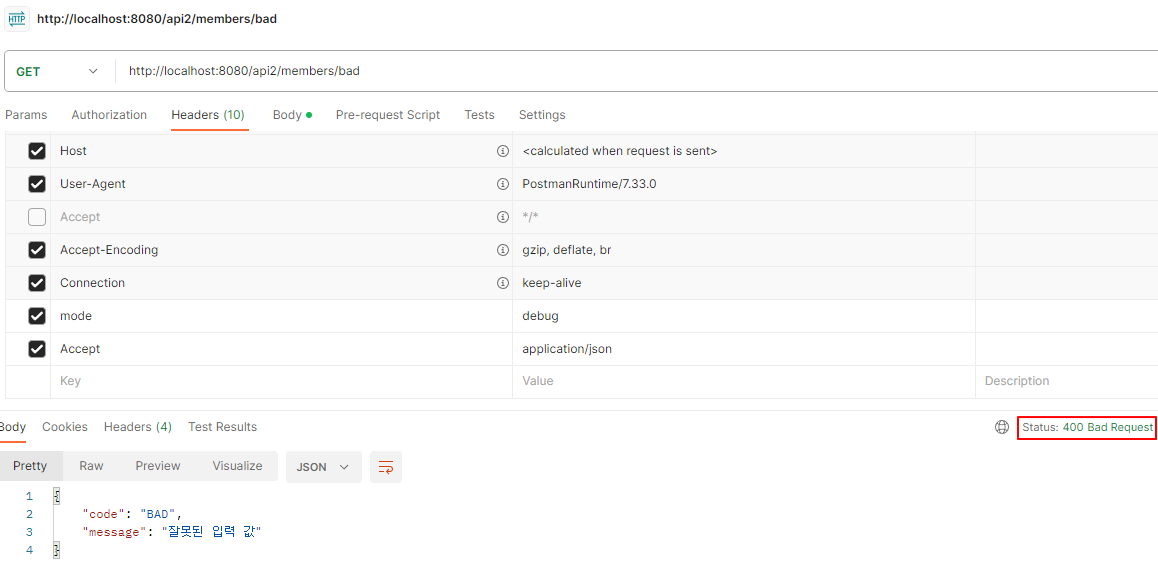 - @ResponseStatus(HttpStatus.BAD_REQUEST)를 지정했으므로 HTTP 상태 코드 400으로 응답한다.