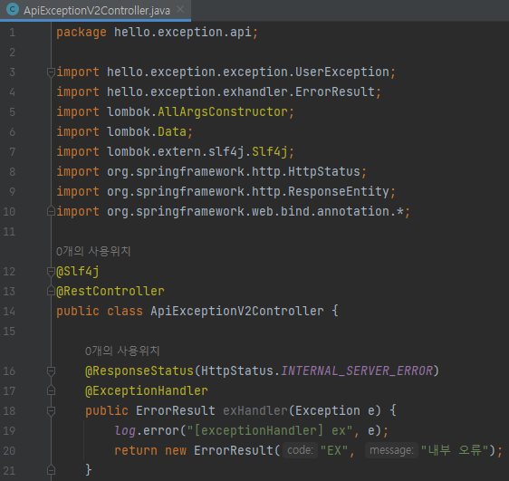 package hello.exception.exhandler; import lombok.AllArgsConstructor; import lombok.Data; @Data @AllArgsConstructor public class ErrorResult { private String code; private String message; }