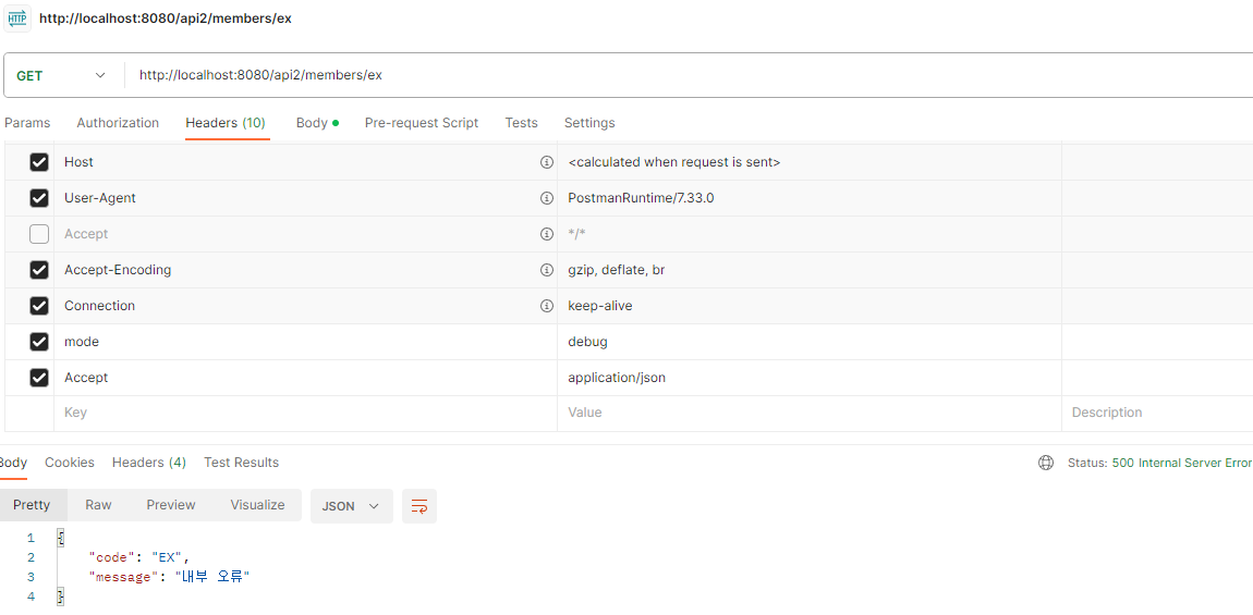 - @ResponseStatus(HttpStatus.INTERNAL_SERVER_ERROR)로 HTTP 상태 코드를 500으로 응답한다
