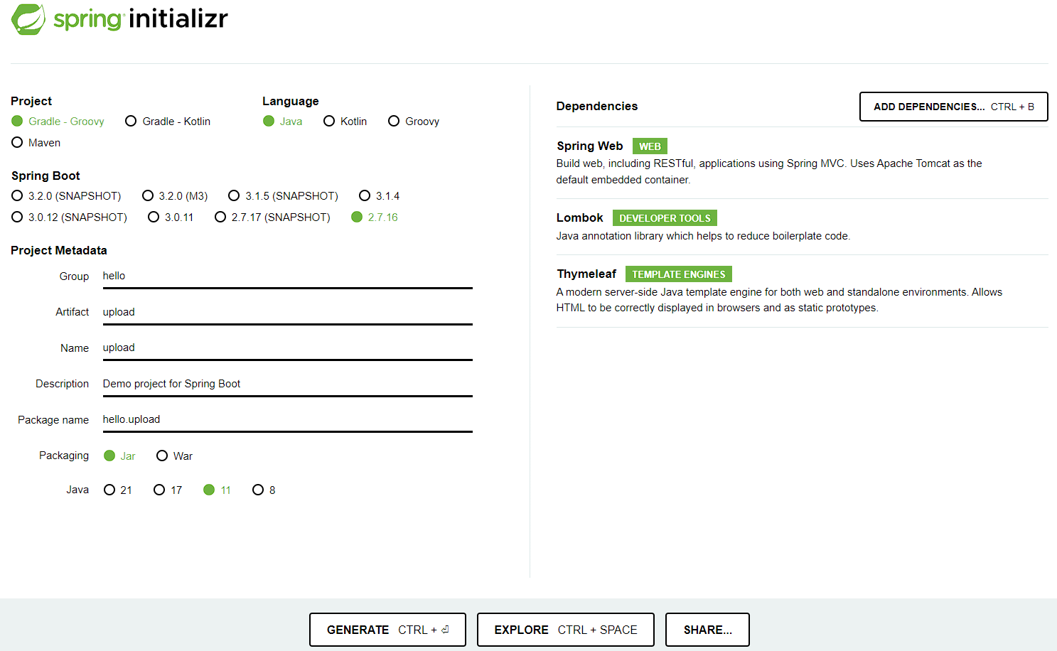 - Dependencies : Spring Web, Lombok, Thymeleaf