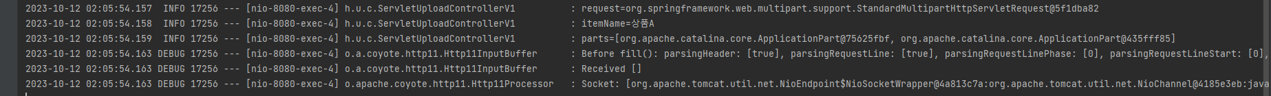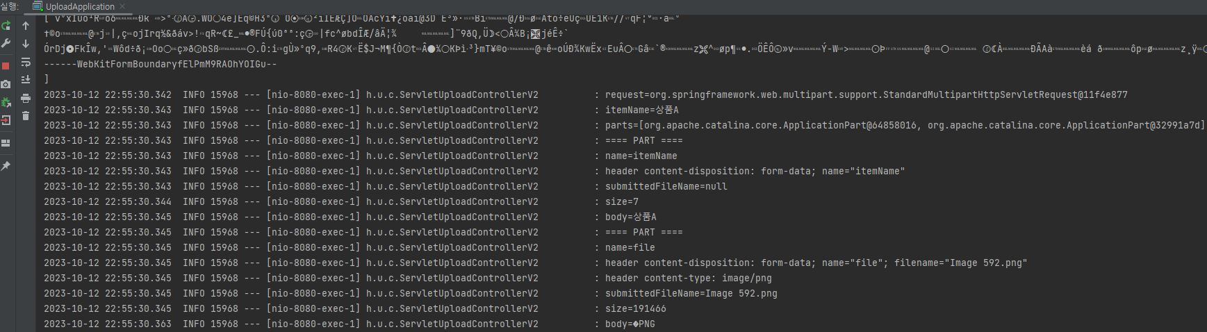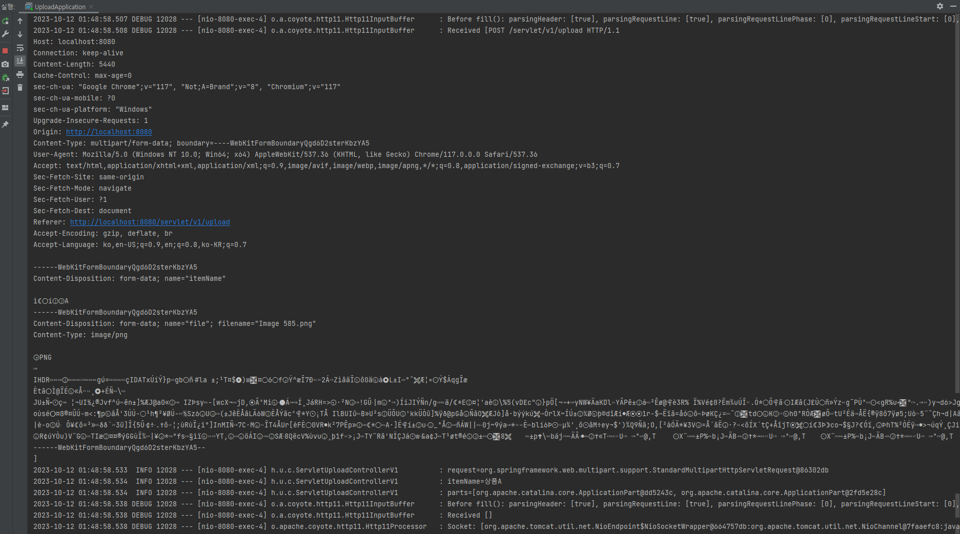 실행해 보면 logging.level.org.apache.coyote.http11 옵션을 통한 로그에서 multipart/formdata 방식으로 전송된 것을 확인할 수 있다.