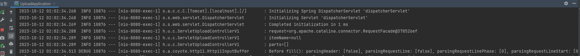 그래서 결과 로그를 보면 request.getParameter("itemName"), request.getParts()의 결과가 비어있다.